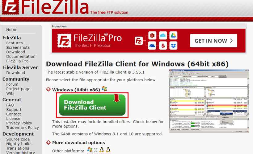 ※以下解説画像は、FileZilla公式サイトの更新やソフトのバージョンアップにより変更される可能性がございます。